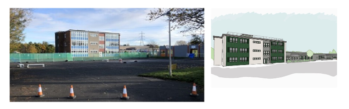 This has included repair works, new cladding on the external walls and roof, replacement of existing windows and curtain walling, and floor finishes and redecoration across the whole building. Accessibility to the building has also been improved by removing existing steps and introducing new ramps to specific areas around the school.